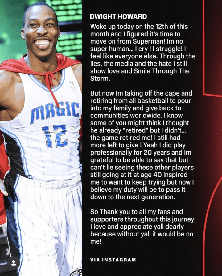 搜狐体育消息,北京时间3月13日,魔兽霍华德发布长文,宣布退役,结束20年篮球职业生涯。